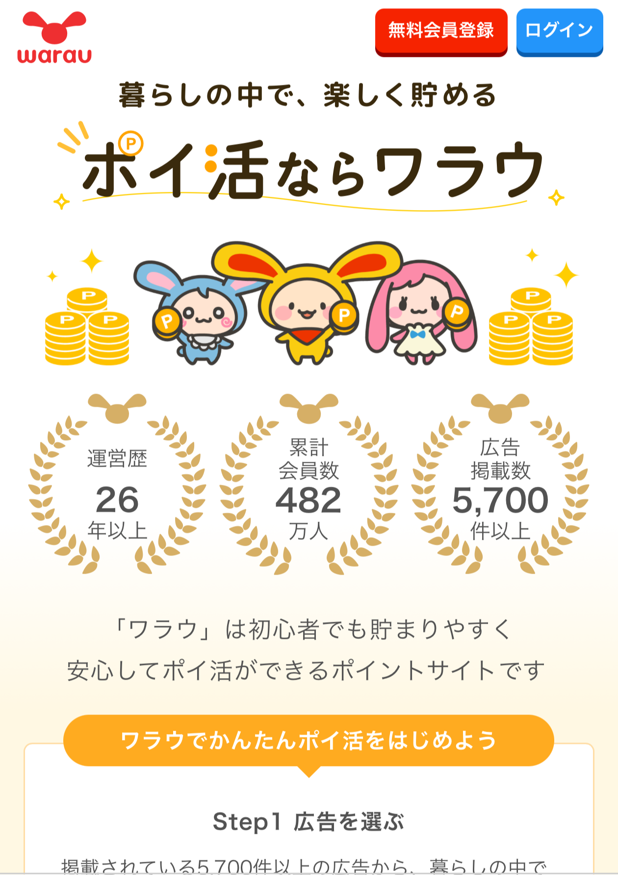 この中で多く紹介がされていたポイ活サイトの「WARAU」に登録しました。